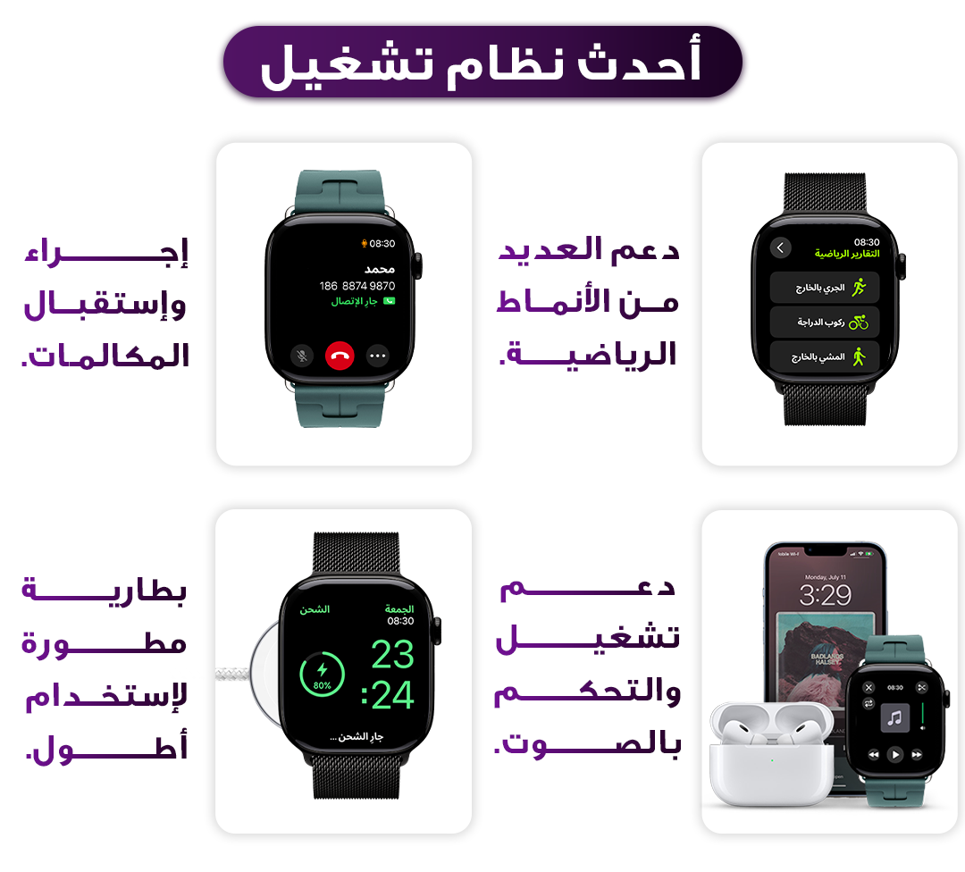 • الوظائف: متابعة اللياقة، إشعارات، مراقبة صحية