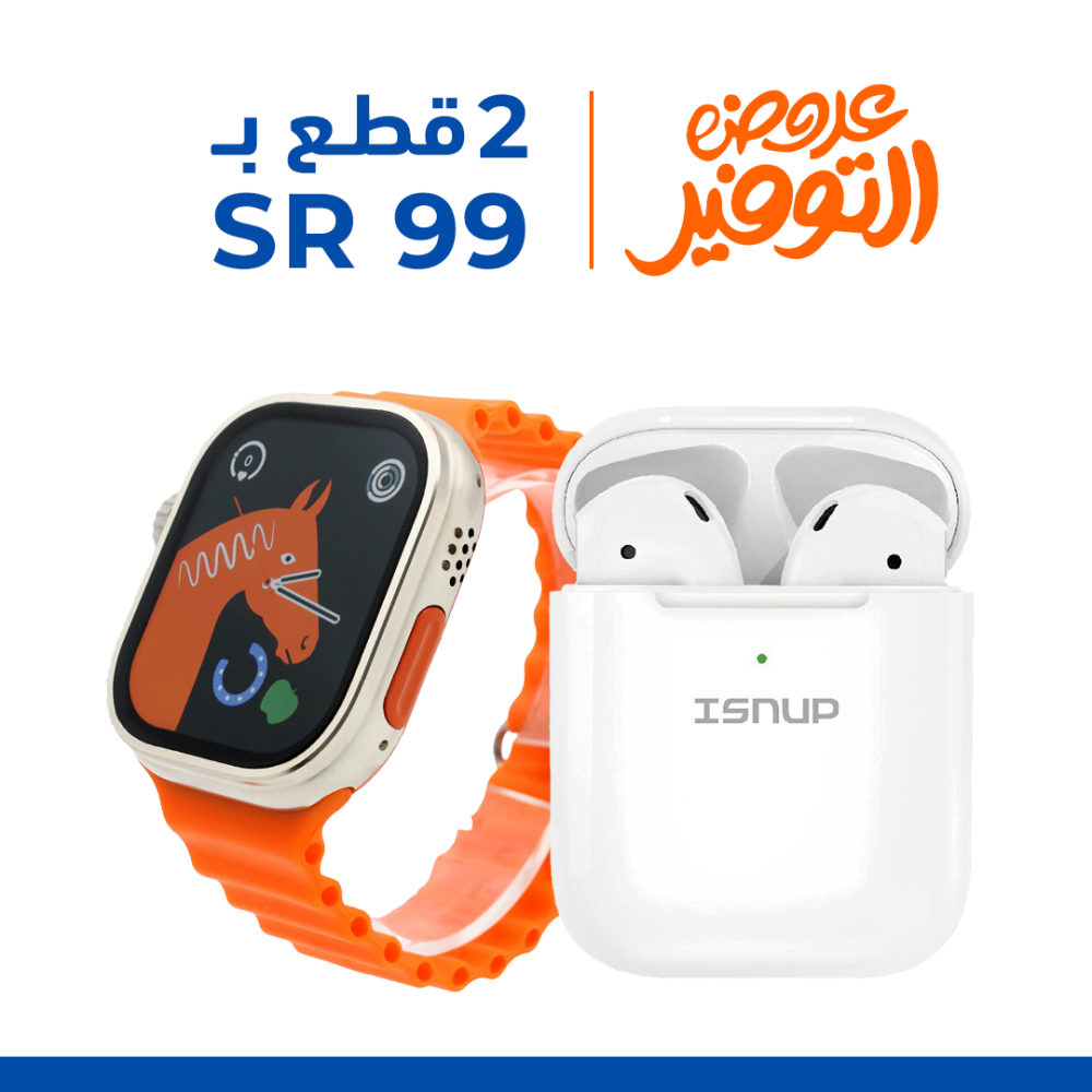 ساعة ذكية ultra 8 HW 8 ULTRA + سماعة ايربودز الإصدار الثاني هي الباقة المثالية لعشاق التقنية الذين يبحثون عن الأداء القوي والتصميم العصري. الساعة تأتي بتقنيات متقدمة وشاشة كبيرة تدعم اللمس الكامل، بينما توفر السماعة صوتًا نقيًا وتجربة استماع لاسلكية مريحة تدوم طويلًا.